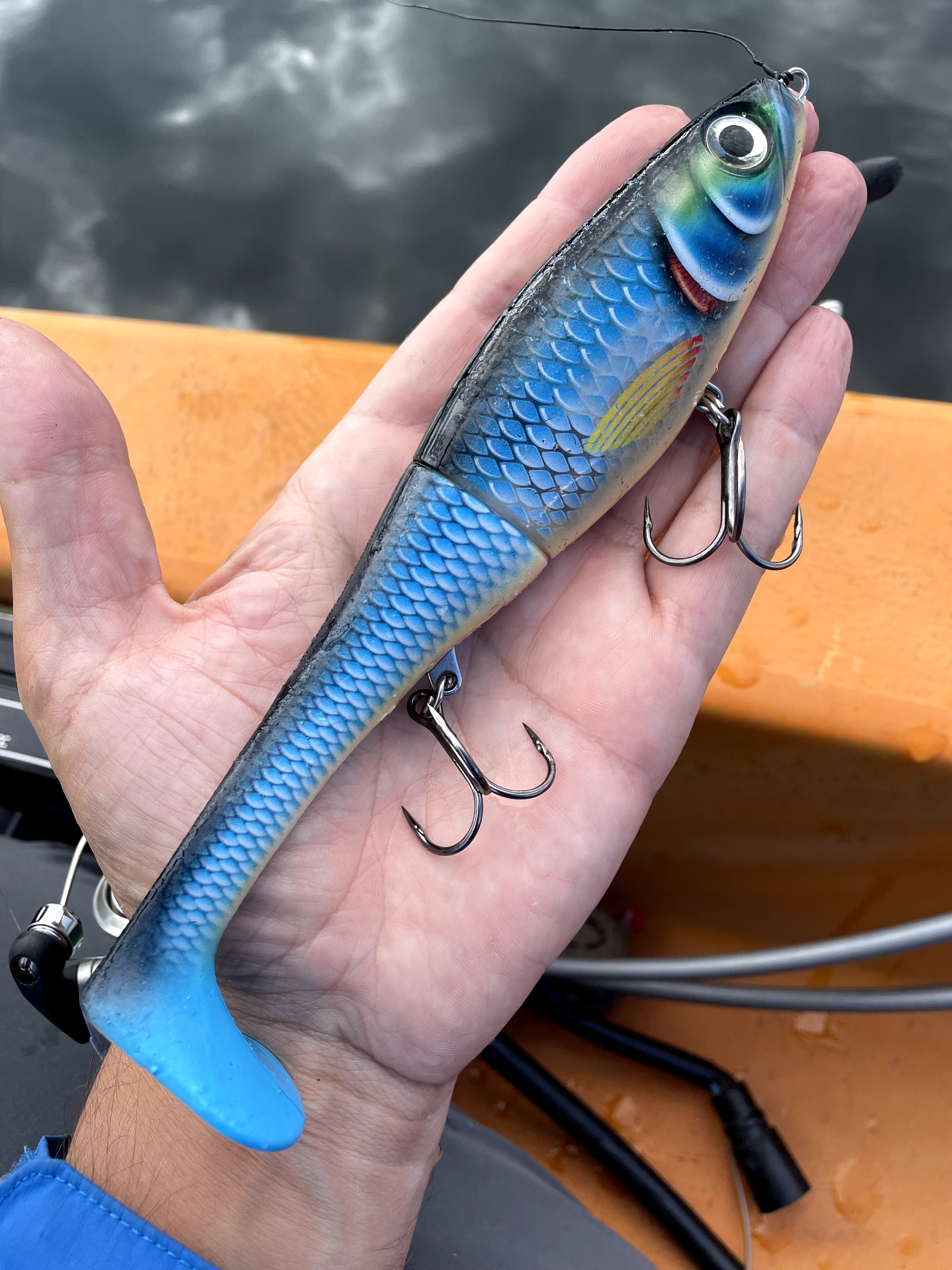 Arrivano le undici della mattina e si comincia a sentire qualche mangiata, si vede qualche attacco e si capisce che la giornata promette bene. Alle 11:15, mentre è al telefono e recupera stancamente in grosso streamer cercando di non far cadere in acqua il cellulare bloccato tra orecchio e spalla, alle 11:15 eccolo! Attacca sotto barca, gli siamo passati sopra a scarroccio e non s’è minimamente preoccupato della nostra presenza. Germano saluta e mette giù il telefono e inizia un combattimento surreale, prontamente trasmesso in diretta instagram dal sottoscritto nel quale si nota la calma incredibile con cui viene portato in barca il pescione.