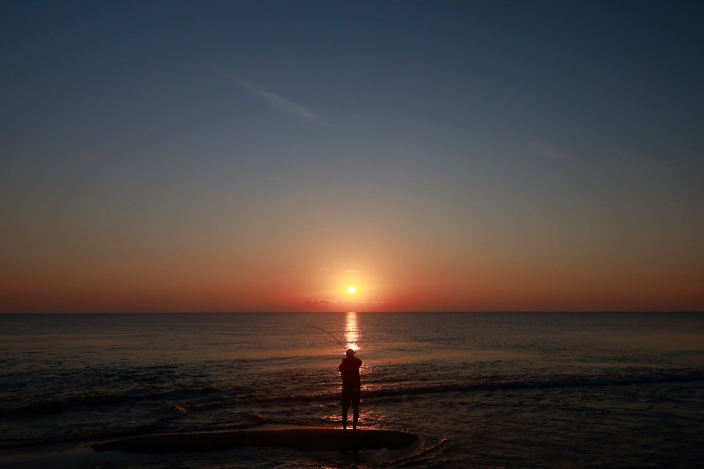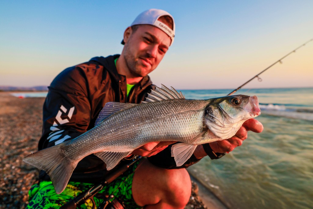 Dopo un breve combattimento, sfruttando a nostro favore la corrente che scorre da destra verso sinistra, la spigola è tra le mani di Nicola. La luce dell’alba tinge tutto di rosso e l’argento del corpo del pesce risalta ancora di più al contrasto col pescatore.
