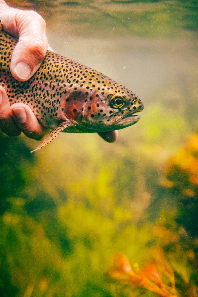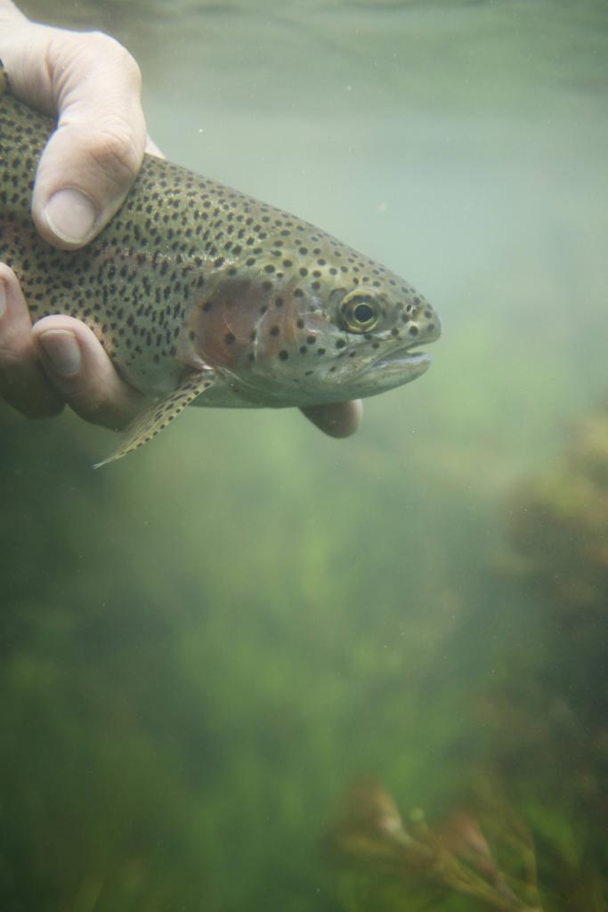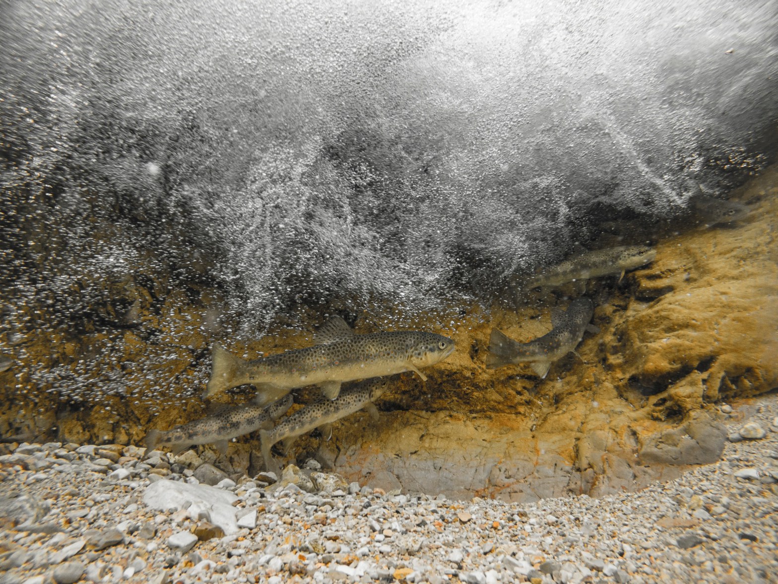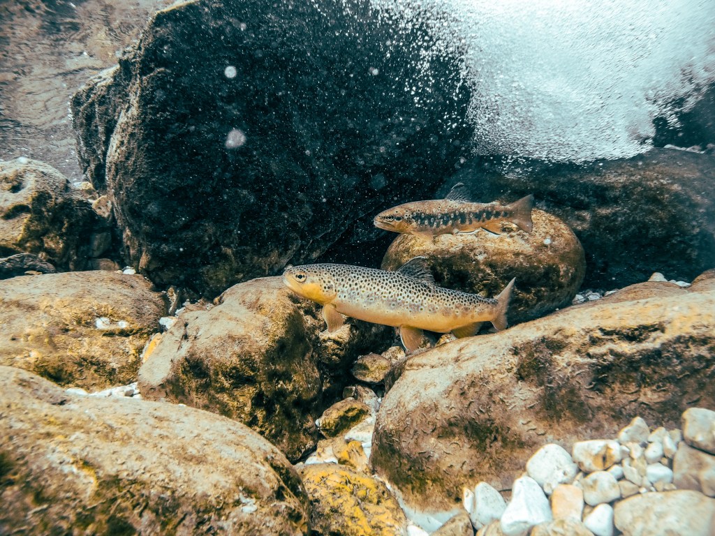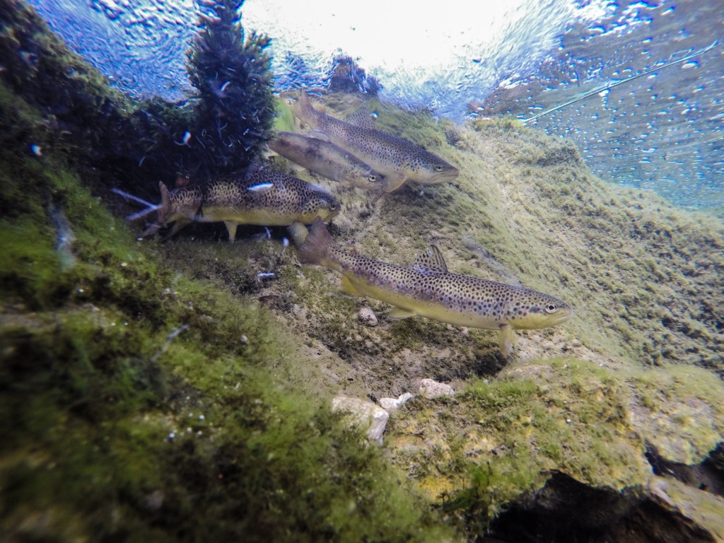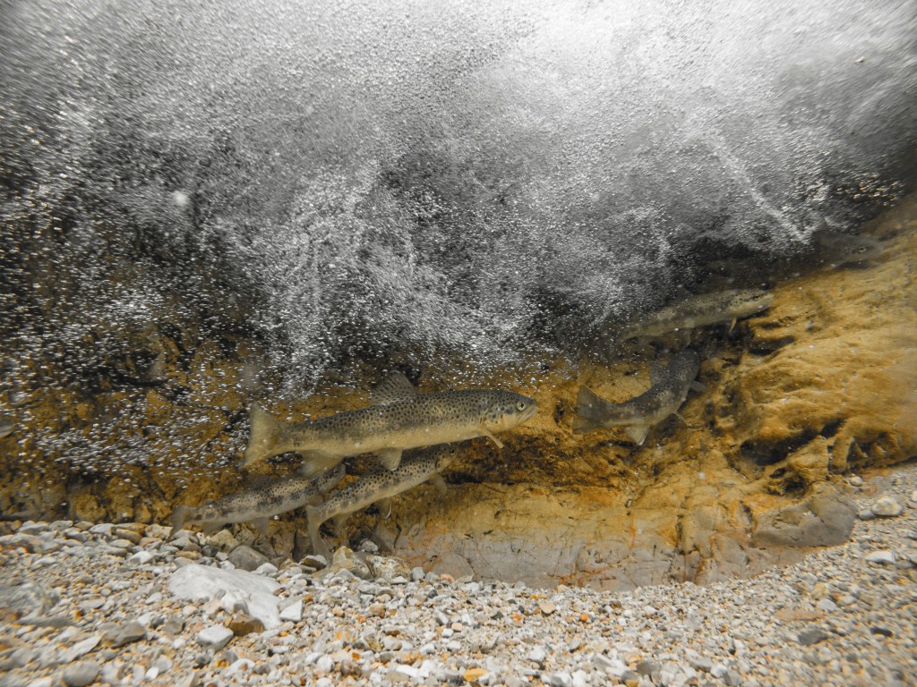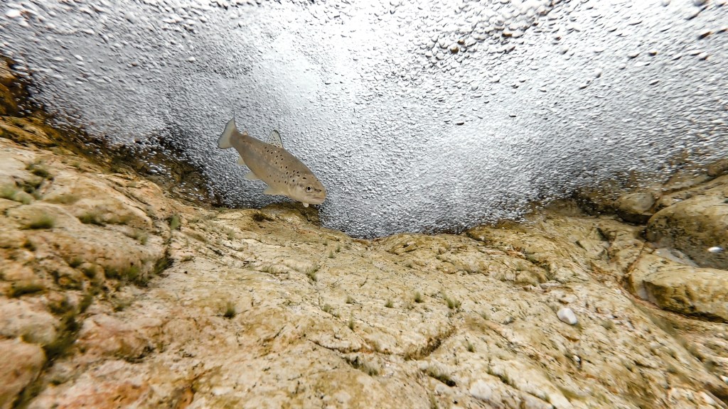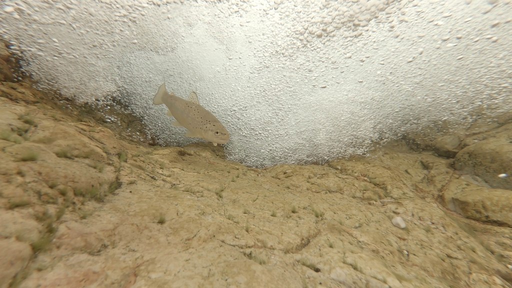 La seconda soluzione è cablare il tutto: portare il segnale video su uno schermo esterno usando un cavo usb attaccato all’action cam di turno (e impermeabilizzando il tutto con un generoso uso di silicone nel case) o usando un cavo antenna per portare il segnale WiFi fuori dall’acqua. È una soluzione un po’ più macchinosa, ma permette di raggiungere profondità maggiori e aiuta a raggiungere punti nei quali anche l’immersione è esclusa, sia per eccessiva velocità e pericolosità delle acque, sia per profondità ridotte. Questa immagine è stata realizzata immergendo una GoPro cablata sotto una cascata e inviando i comandi dal telefono. Il vantaggio di questa tecnica è che il pesce tende a essere meno disturbato dalla presenza della telecamera e si riesce a trovarlo in situazioni più naturali.